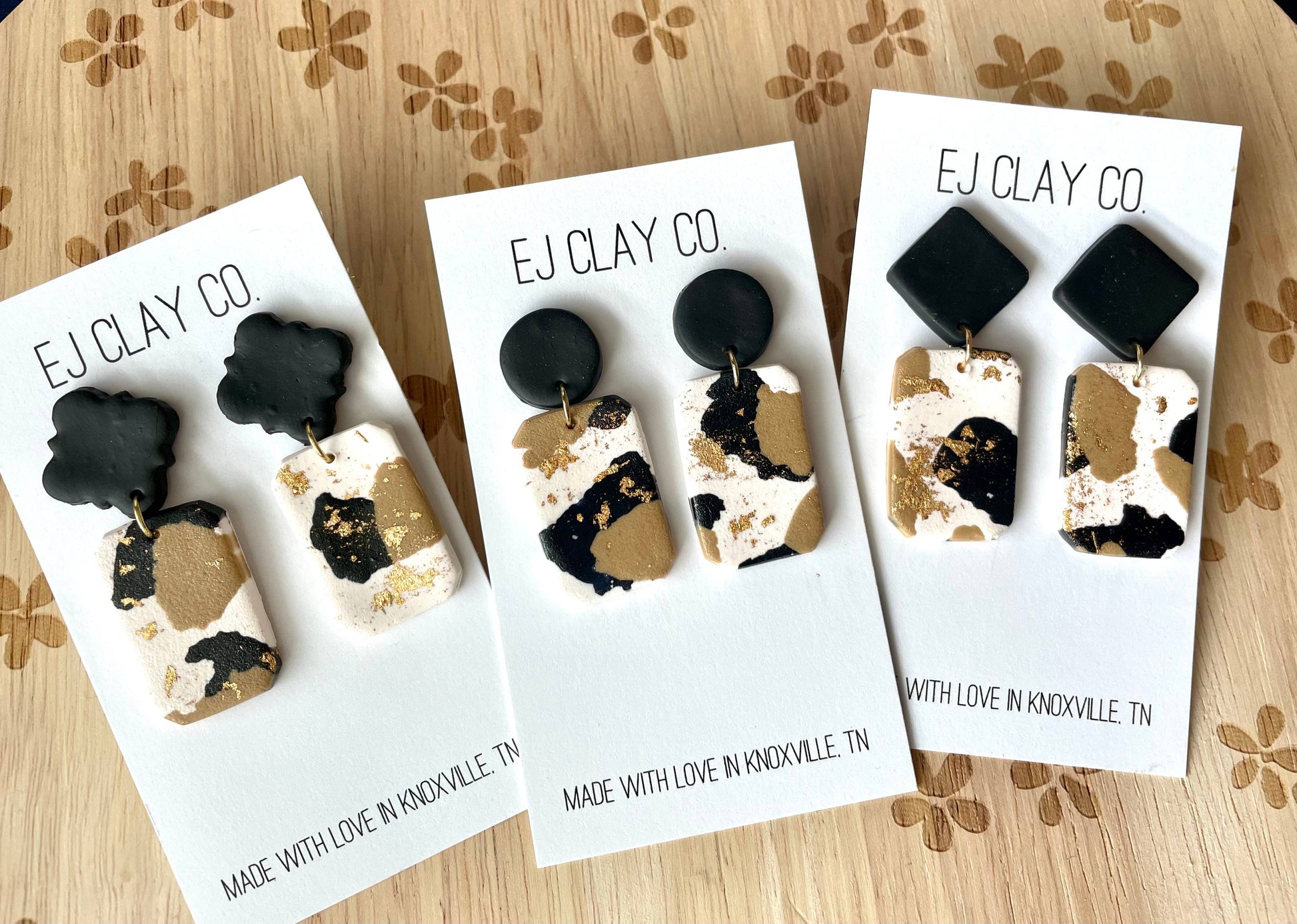 Experience elegance with our Neutral Gold Dangles. These earrings blend black and brown hues with a touch of gold flake, creating a unique aesthetic. Part of EJ Clay Co's collection, these dangles reflect our Knoxville-based brand's commitment to handcrafting exceptional clay accessories. These lightweight earrings are made with nickel and lead-free backs, ensuring a comfortable fit for sensitive ears. All dangles have additional plastic backs and are packed in boxes with air bubbles for safe delivery. Support a small business with a passion for thriving with EJ Clay Co.