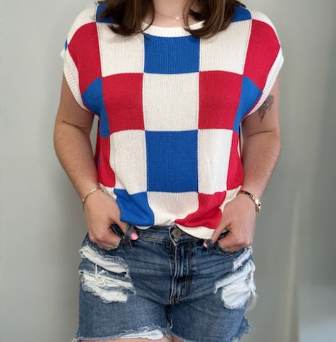 * This lightweight knit top features a boxy fit, fashionable and relaxed The checkered print is perfect for going from edgy to dressy The cap sleeve style adds a romantic touch Style it up by pairing with jeans and be the talk of the town